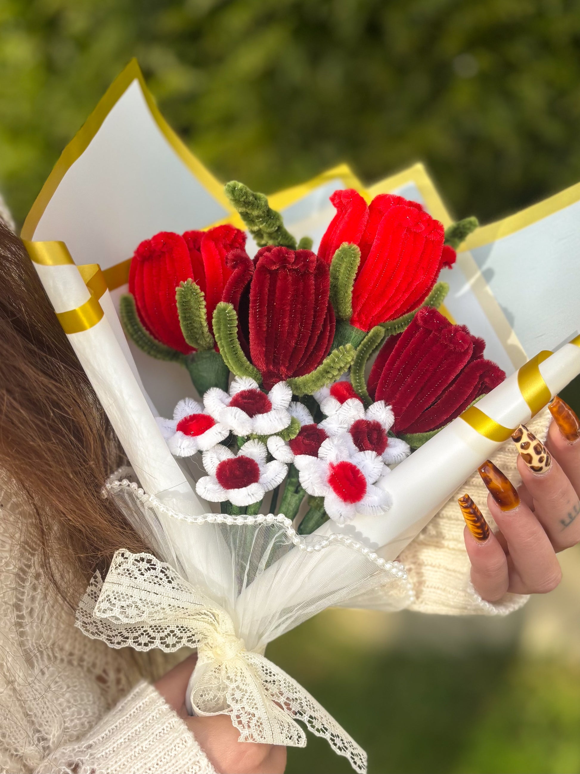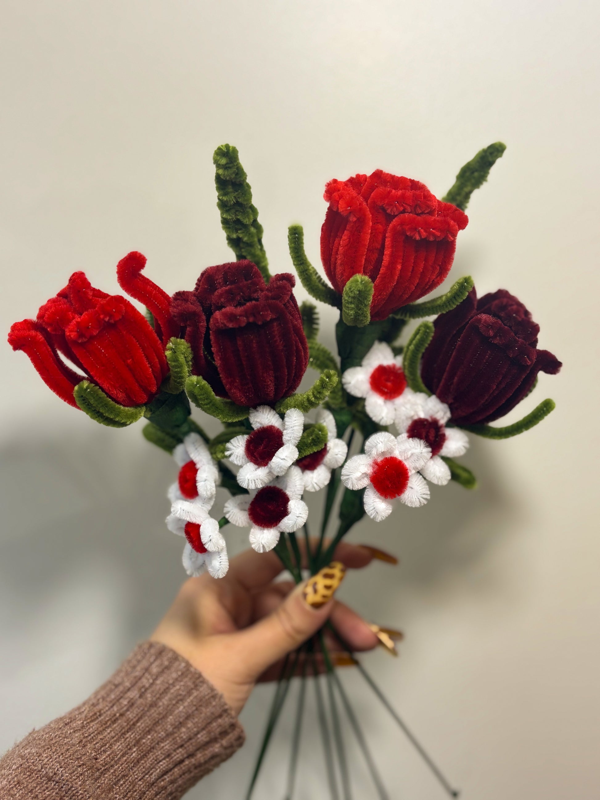 Matériaux : Fil chenille, tige en fer, papier floral, ruban...