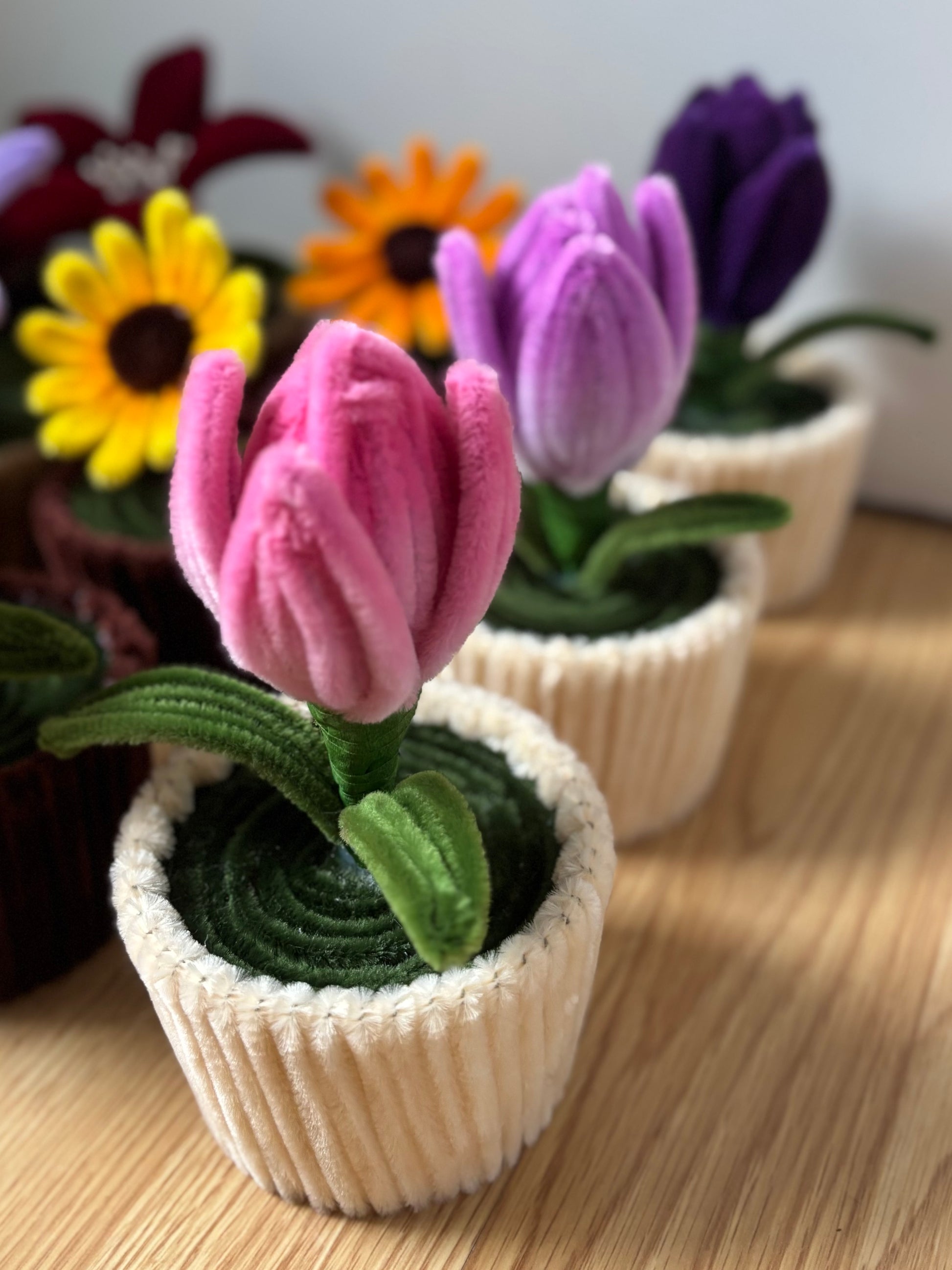 Matériaux : Fil chenille, tige en fer, papier floral, ruban...